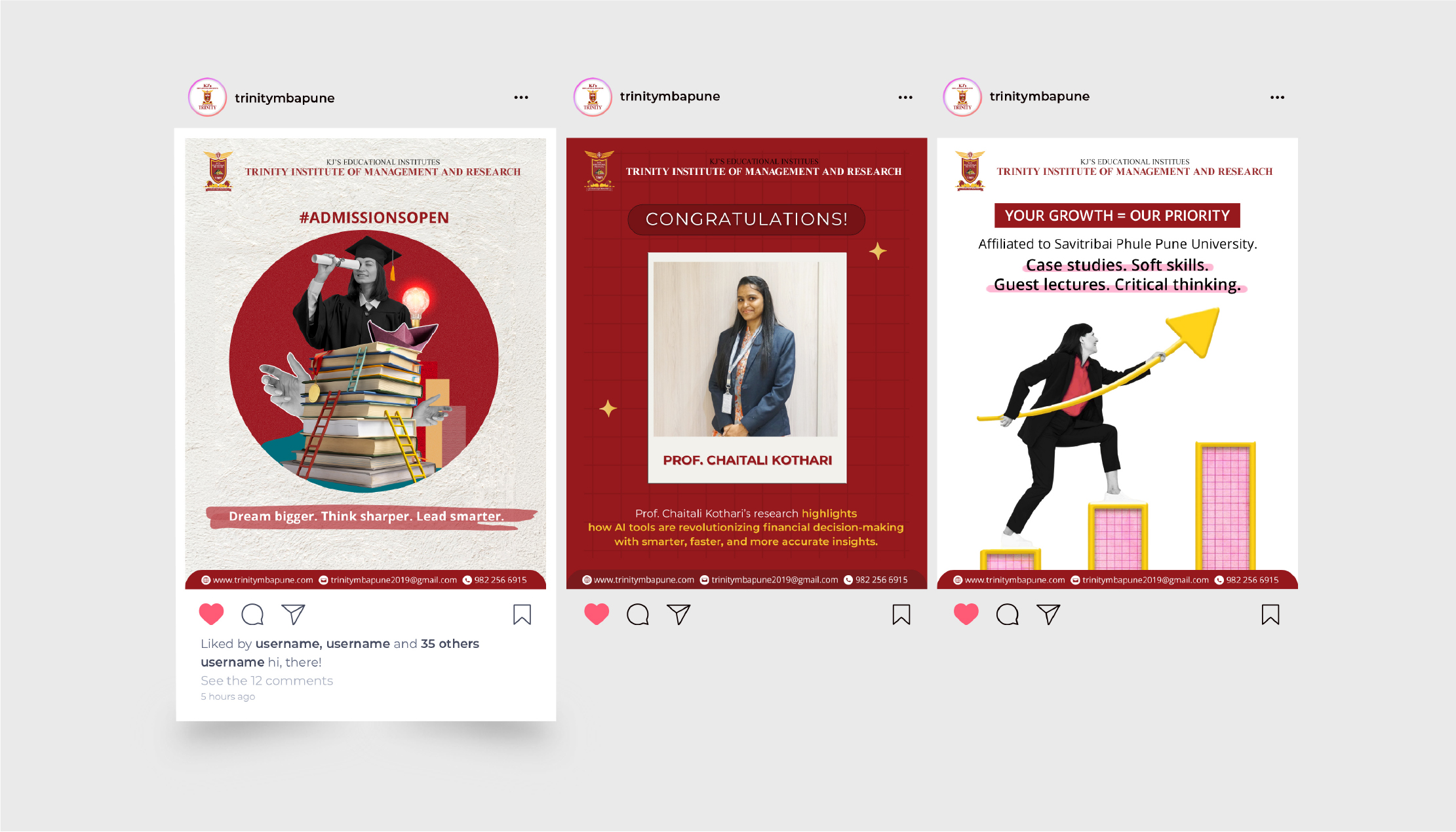 Visually, we leveraged Trinity’s bold red and yellow identity to create high-impact, scroll-stopping creatives. From concept-driven posts to informative carousels and engaging reels, the content balanced aspiration with clarity, ensuring students not only noticed the brand but connected with it.